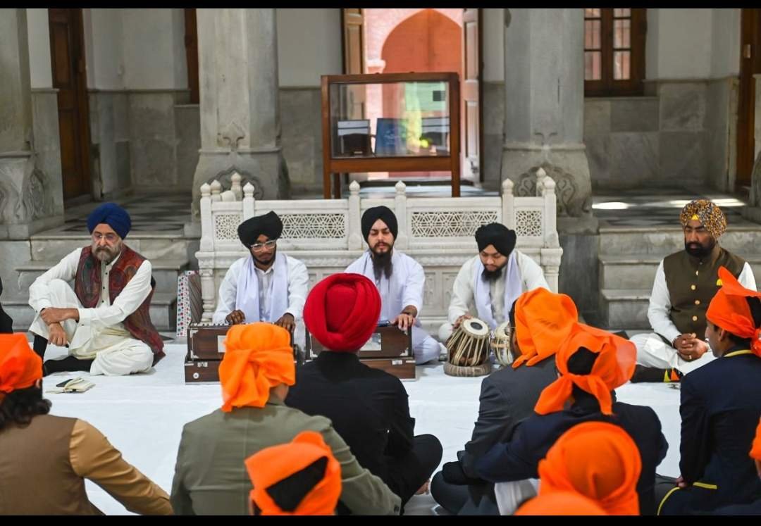 (1) लाहौर स्थित एचिसन कॉलेज गुरुद्वारा साहिब में शुक्रवार, 13 फरवरी 2026 को शबद कीर्तन प्रस्तुत करता रागी जत्था।