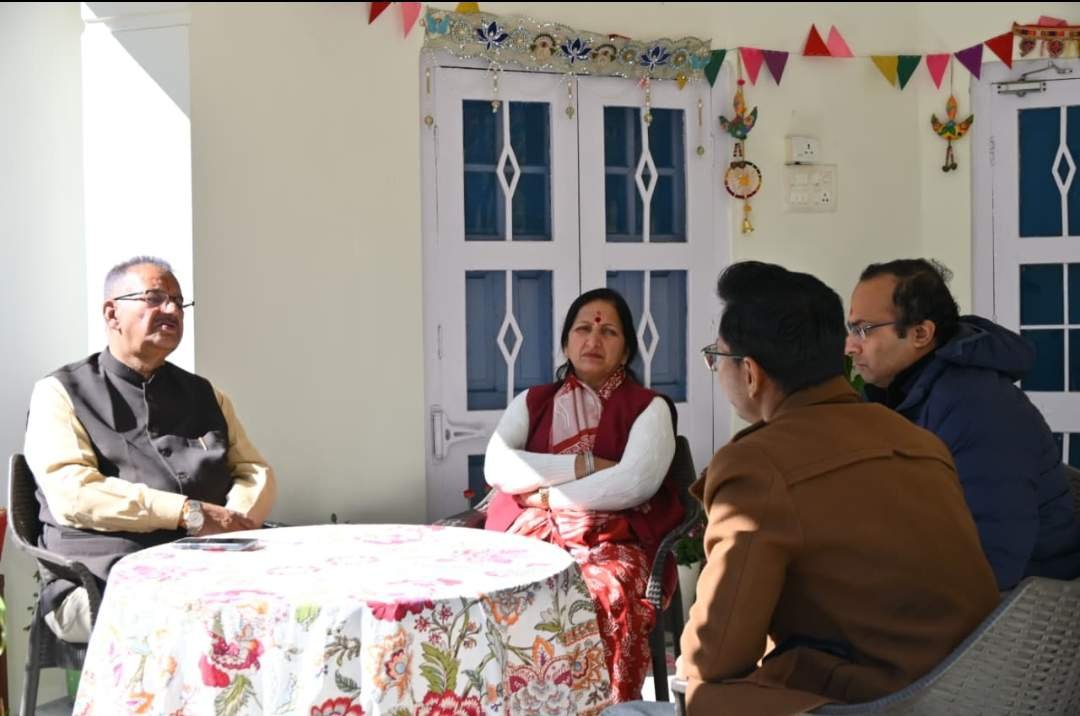 शासकीय आवास में मसूरी की पार्किंग व्यवस्था एवं वेंडर जोन निर्माण को लेकर बैठक करते कैबिनेट मंत्री गणेश जोशी